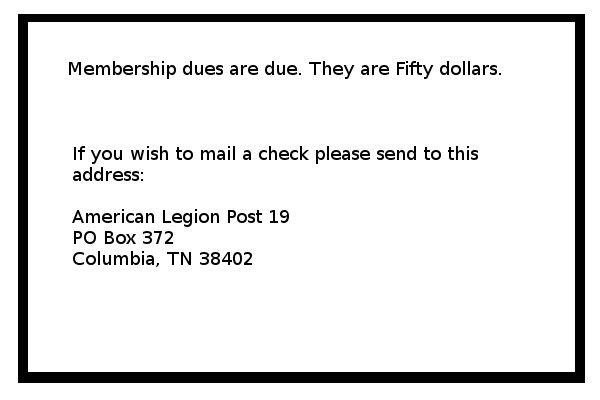 YOUR 2026 LEGION DUES ARE DUE. I UNDERSTAND MANY OF YOU HAVE SENT YOUR DUES IN AND THE POSTAL SERVICE HAS RETURNED THEM TO YOU. WE APOLOGIZE FOR THIS INCONVENIENCE. IF THIS HAS HAPPENED TO YOU, PLEASE SEND YOUR DUES TO: